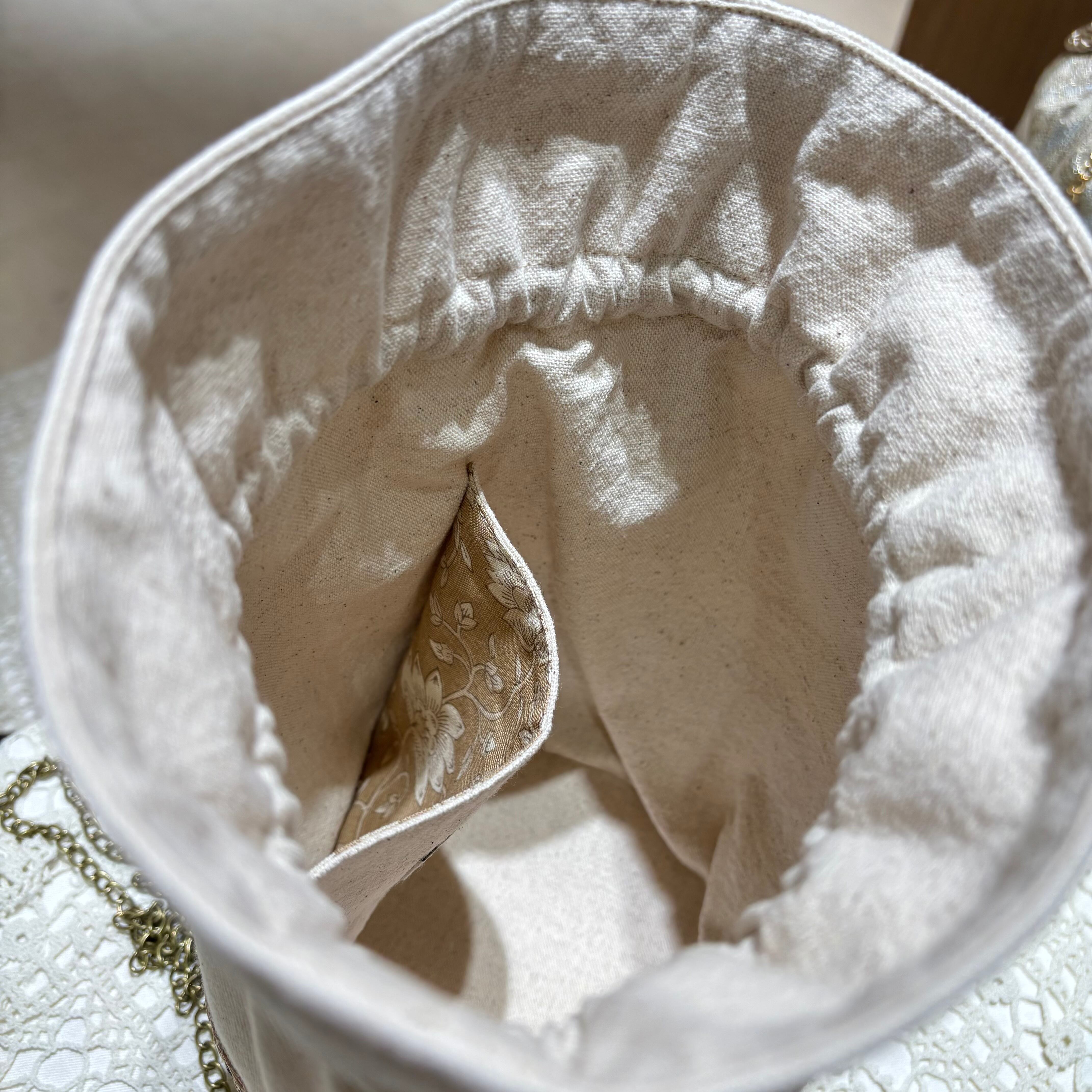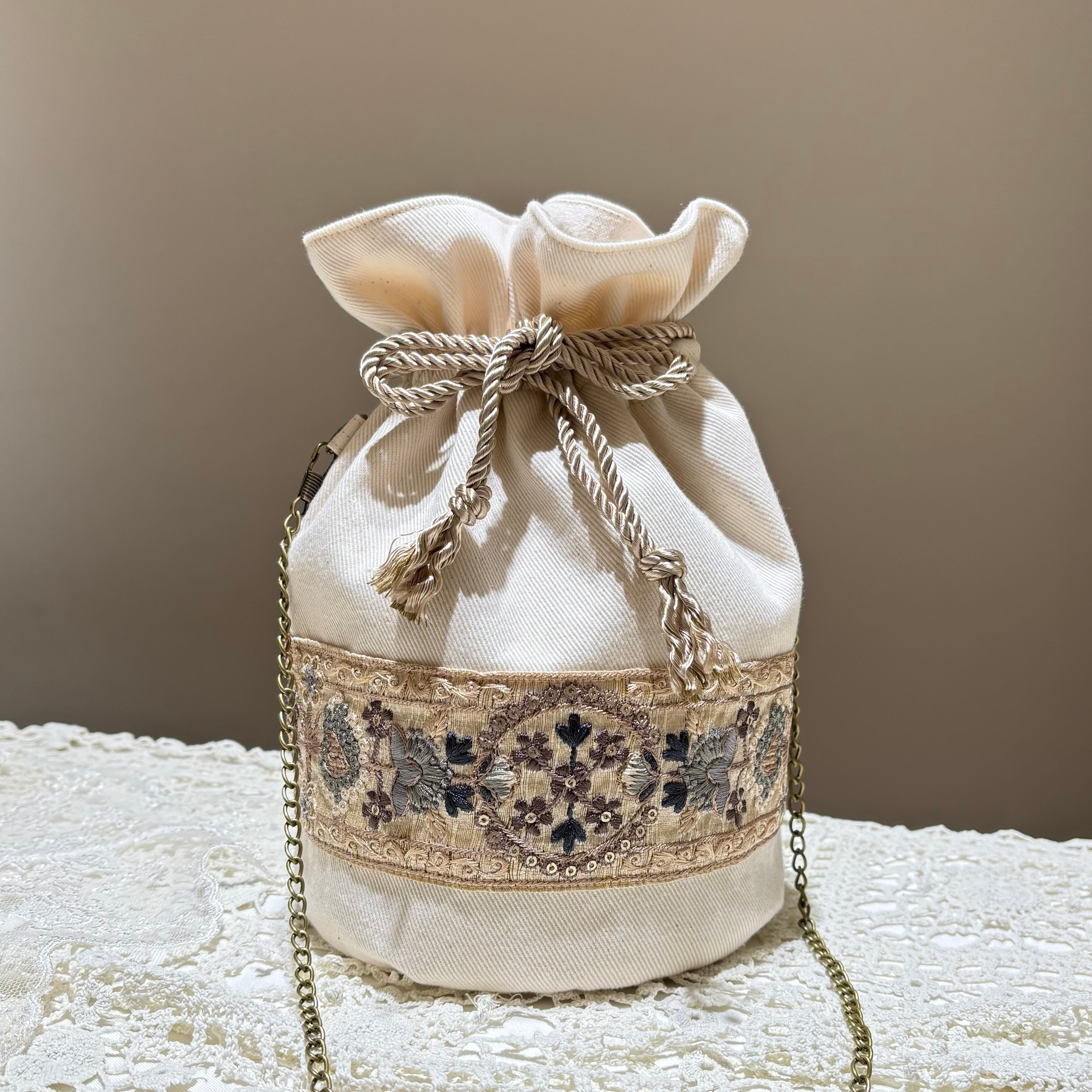 繊細で美しいインド刺繍リボンをあしらった、丸底の巾着ショルダーポーチです